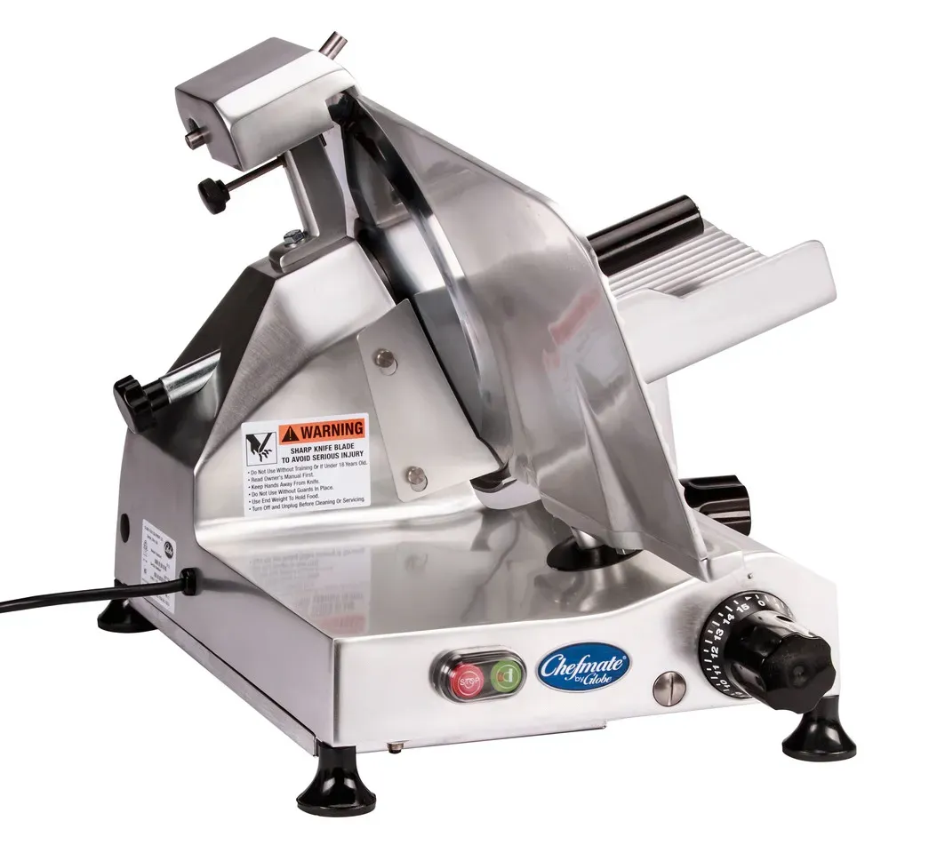 Revolutionize your cooking setup with the Globe C12 Food Slicer. This electric food slicer is a game-changer for commercial restaurants, offering efficiency and precision in every slice. The 12" diameter knife allows you to effortlessly slice through a variety of ingredients, from meats to cheeses and vegetables. With a slice thickness range of 0" to 9/16", you have full control over the thickness of each slice. The removable gravity feed food chute makes it easy to load and unload ingredients, while the top-mounted sharpener ensures that your knife stays razor-sharp at all times. The slice deflector and knife cover provide added safety, while the belt-driven, ball bearing chute slide system ensures smooth operation. Made of anodized aluminum, this food slicer is durable and easy to clean. With its 1/3 HP motor, it delivers powerful performance, and the rubber feet keep it stable during use. NSF certified and cETLus listed, this Globe C12 Food Slicer is a reliable and essential tool for any commercial kitchen.
