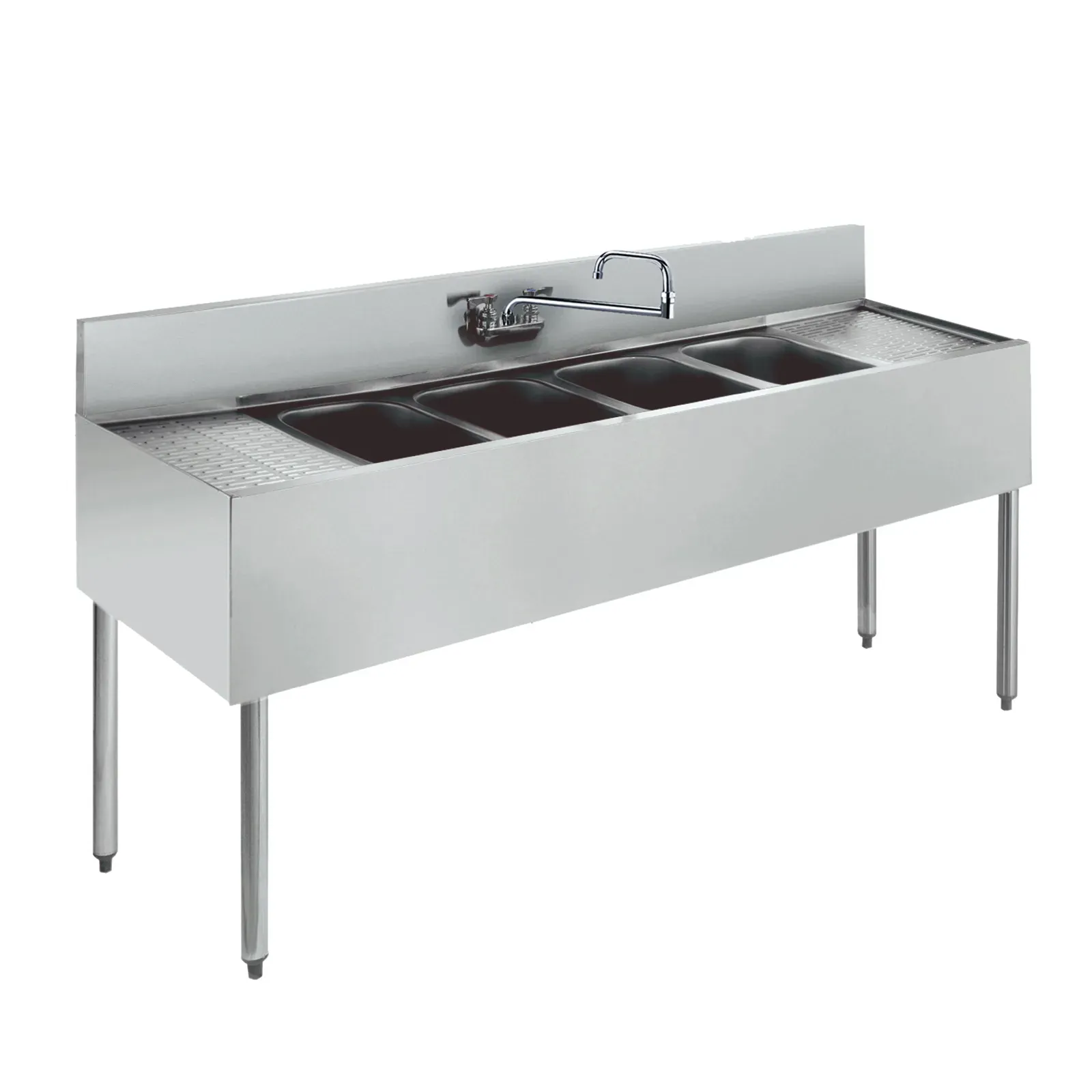 Unleash culinary creativity with the Krowne Metal KR19-74C Bar Sink. This Royal Series 84" Four-Compartment Bar Sink is designed to meet the demands of a busy commercial restaurant. With its four compartments, each measuring 10" wide x 14" front-to-back x 10" deep, this sink provides ample space for washing and rinsing dishes, utensils, and glassware. The 18" drainboards on the left and right sides offer convenient drying areas, while the splash mount Royal Series faucet with a double jointed spout ensures easy access to water. Made of durable stainless steel, this sink is built to withstand the rigors of a commercial kitchen. The apron on the front and sides adds a touch of style, while the removable overflow standpipes and water line kit provide added convenience. With its NSF certification, this Krowne Metal Bar Sink is a reliable and efficient choice for any commercial restaurant.