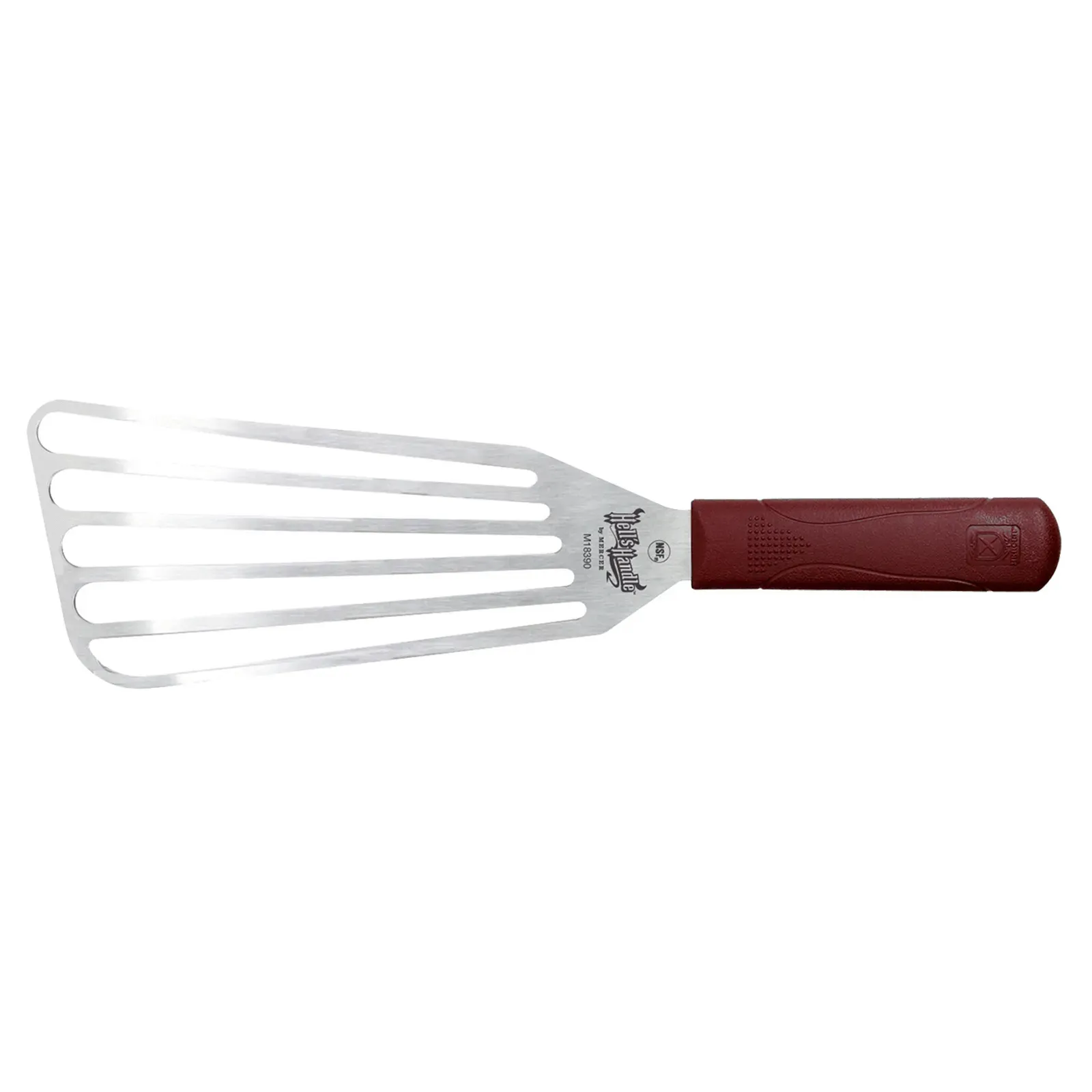 Elevate kitchen operations with the Mercer Culinary, M18390, Turner, Slotted, Stainless Steel. This 9" x 4" Large Fish Turner is a must-have tool for any commercial restaurant. Its large, flexible, and slotted blade allows for easy flipping and turning of delicate fish fillets, ensuring they remain intact. The precision ground, stainless Japanese steel construction guarantees durability and long-lasting performance, even in the busiest kitchen environments. The heat-resistant handle can withstand temperatures up to 450F, providing a safe and comfortable grip. The dual-textured finish on the handle offers extra grip and slip resistance, ensuring precise control during use. With a 14" overall length, this turner provides ample reach and maneuverability. NSF certified, this turner meets the highest standards of safety and sanitation. Elevate your culinary creations with the Mercer Culinary, M18390, Turner, Slotted, Stainless Steel.