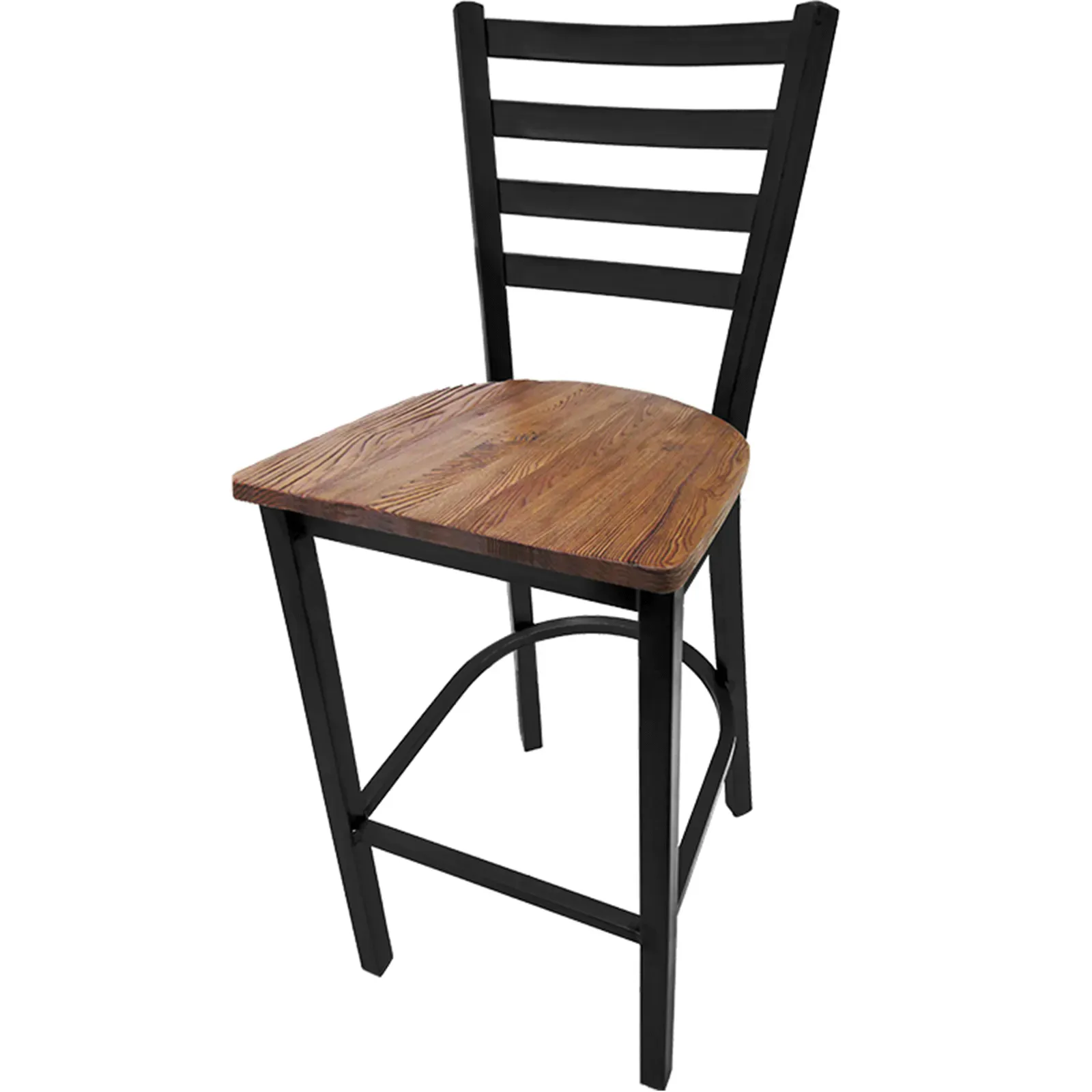 Create an atmosphere that stands out with the Oak Street BM-234-RW Bar Stool. Designed for commercial restaurant use, this bar stool combines style and durability to enhance any dining space. The ladder back design and reclaimed wood seat add a rustic charm, while the mig welded 1.2mm frame and 1-1/4" steel tubing ensure long-lasting strength. The black wrinkle powder coat frame finish adds a sleek touch, while the non-marring poly glides protect your floors. With a footrest for added comfort, this bar stool is perfect for customers looking to relax and enjoy their meal. The seat ships unattached for easy assembly. Whether you're running a trendy bistro or a classic diner, the Oak Street BM-234-RW Bar Stool is the perfect choice to create a welcoming and stylish atmosphere.