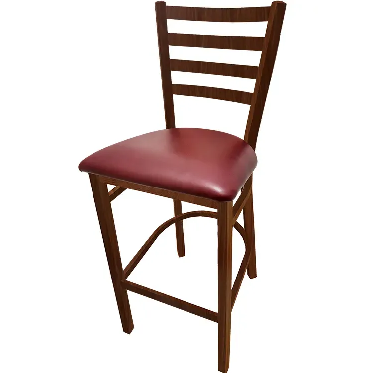 Upgrade the ambiance of your commercial restaurant with the Oak Street BM-234W-WA-WINE Bar Stool. This indoor bar stool features a metalwood ladderback design with a walnut finish frame, exuding a sophisticated and rustic charm. The wine vinyl seat adds a touch of elegance and comfort for your patrons. Crafted with a 1.2mm steel frame and 1-1/4" tubing, this bar stool is built to withstand the demands of a busy restaurant environment. The metalwood frame is painted to resemble real wood grain and is coated with a premium clear coat finish, ensuring durability and longevity. With a 100% welded frame and footring, this bar stool provides stability and support. The non-marring glides protect your floors, while the standard leg supports offer additional reinforcement. Simple assembly is required, and the seat ships unattached from the frame. Upgrade your restaurant seating with the Oak Street BM-234W-WA-WINE Bar Stool and impress your customers with its superior design and quality.