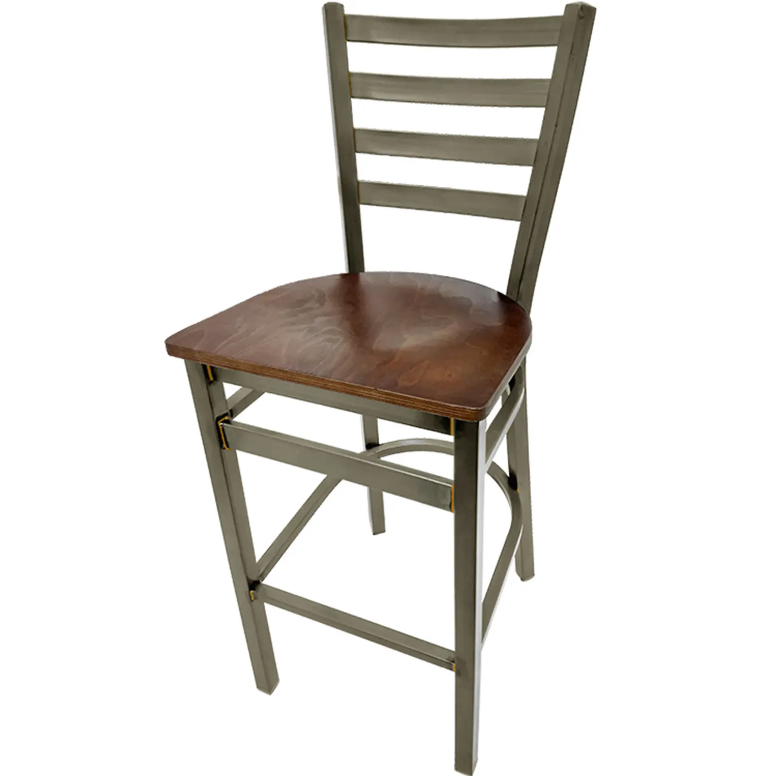 Enhance Vision Elegant Decor with Oak Street's SL135C-1-BRASS-WA Bar Stool. Designed for commercial restaurant use, this indoor bar stool combines style and durability to elevate any dining space. The clear coat ladderback metal frame with brass welds exudes elegance, while the walnut stain wood seat adds warmth and sophistication. The premium clear coat finish ensures long-lasting beauty, while the 1.2mm steel frame and 1-1/4" tubing provide exceptional strength and stability. With a 100% welded frame and footring, this bar stool is built to withstand the rigors of a busy restaurant environment. The non-marring glides protect your floors, and the standard leg supports offer additional reinforcement. Simple assembly is required, as the seat ships unattached from the frame. Trust Oak Street's SL135C-1-BRASS-WA Bar Stool to enhance your restaurant's vision of elegant decor.