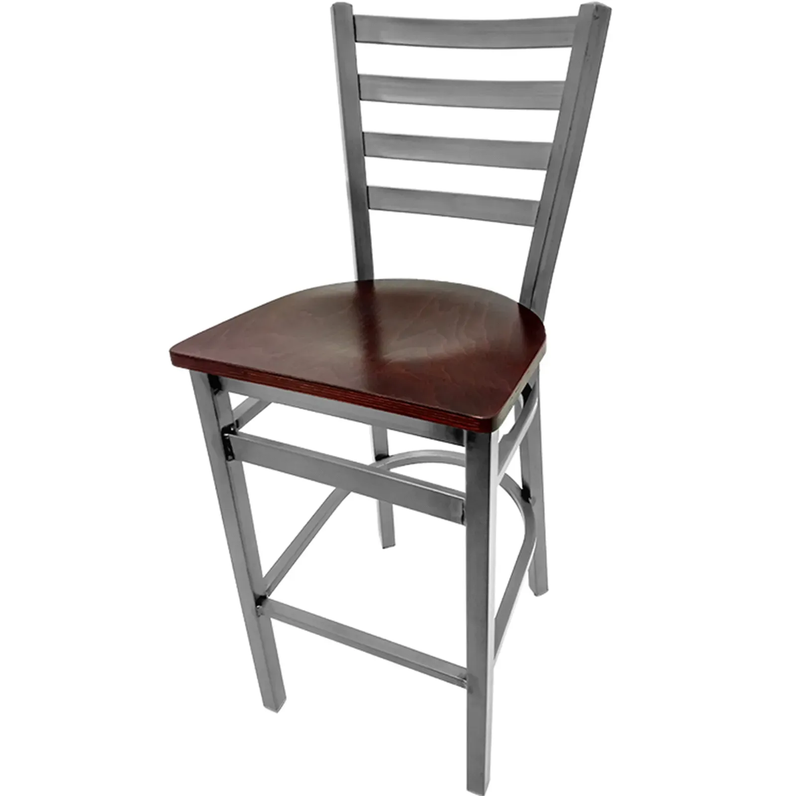 Elevate guests' comfort and enjoyment with the Oak Street SL135C-1-PLAIN-M Bar Stool. Designed specifically for commercial restaurant use, this bar stool combines style and durability to enhance any dining space. The mahogany stain wood seat adds a touch of elegance, while the clear coat metal frame with plain welds ensures long-lasting performance. The premium clear coat finish protects against daily wear and tear, while the 1.2mm steel frame and 1-1/4" tubing provide exceptional strength and stability. With a 100% welded frame and footring, this bar stool is built to withstand heavy use. Non-marring glides protect your floors, and the standard leg supports offer additional stability. The seat ships unattached from the frame for easy assembly. Trust Oak Street to deliver high-quality, reliable seating solutions for your restaurant.