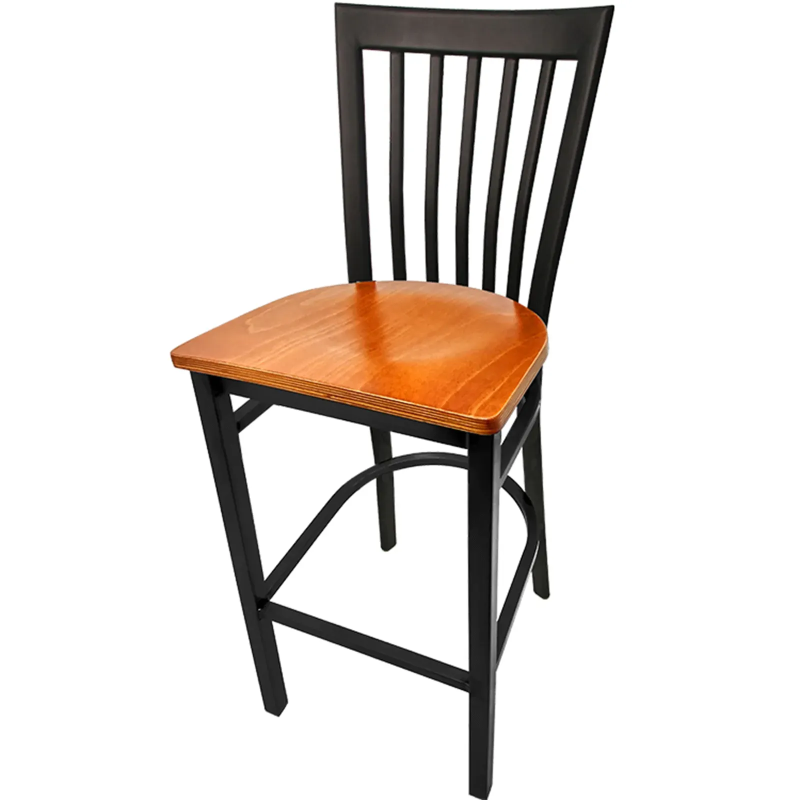 Deliver comfort with class with the Oak Street SL4279-1-C Bar Stool. Designed specifically for commercial restaurant use, this bar stool combines style and durability to enhance any dining space. The jailhouse metal frame, with its premium black powder coat wrinkle finish, not only adds a touch of sophistication but also ensures long-lasting performance. The cherry stain wood seat complements the black frame perfectly, creating a visually appealing contrast. Crafted with a 1.2mm steel frame and 1-1/4" tubing, this bar stool is built to withstand the demands of a busy restaurant environment. The 100% welded frame and footring provide additional stability and support. Non-marring glides protect your floors from scratches and scuffs. With simple assembly required, this bar stool is a convenient choice for any restaurant owner looking to elevate their establishment's aesthetic while providing comfort for their patrons.