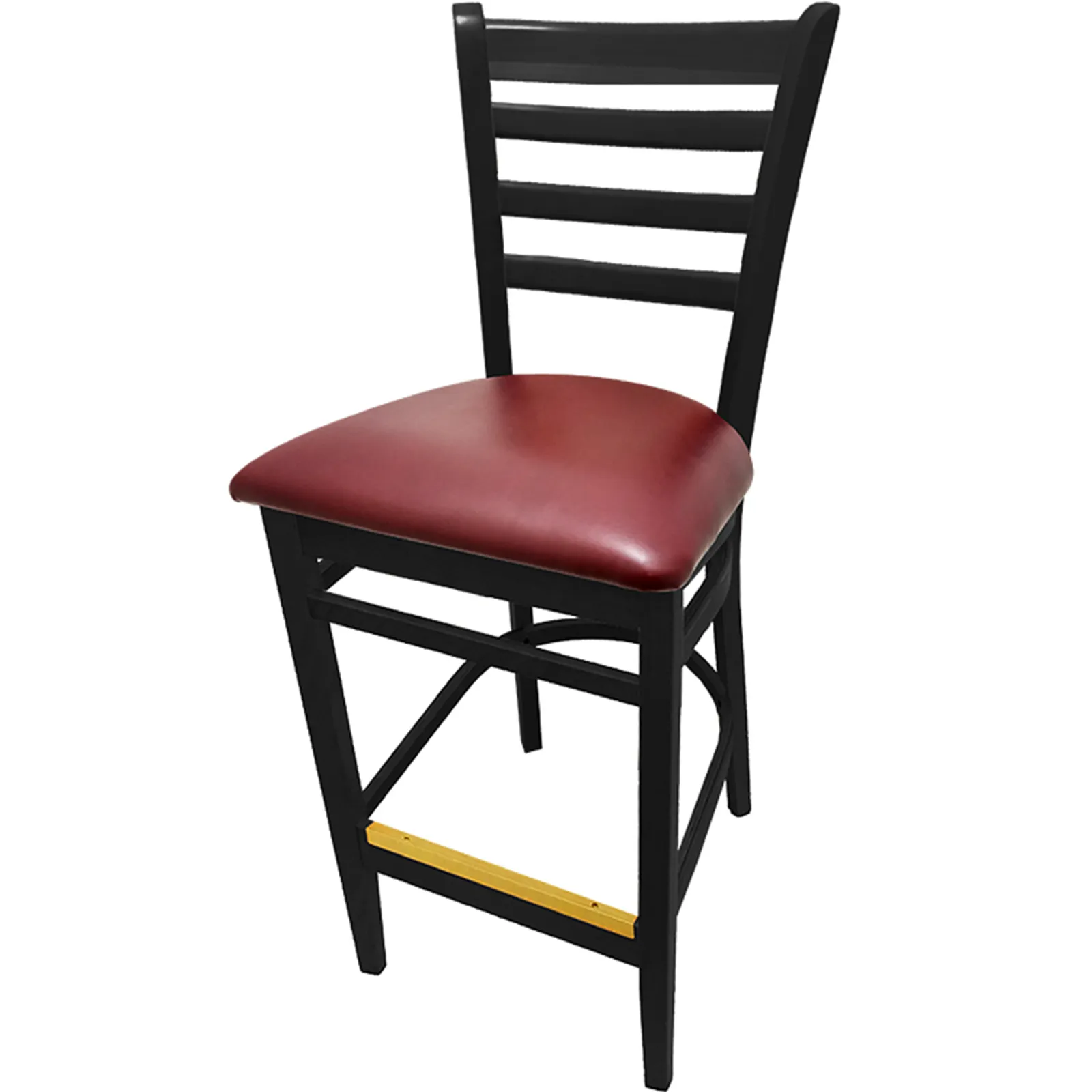 Furnish your eatery for success with the Oak Street WB101BLK-WINE Bar Stool. Designed specifically for commercial restaurant use, this ladderback barstool combines style and durability to enhance your dining space. The solid European beech frame ensures long-lasting strength, while the black stain with dye adds a touch of sophistication. The wine vinyl seat not only provides comfort but also adds a pop of color to your establishment. Constructed with quality fabric-backed, commercial-grade vinyl, the seat is easy to clean and maintain. With two leg supports and non-marring glides, this bar stool offers stability and protects your floors from scratches. Although the seats ship unattached, the simple seat attachment required makes assembly a breeze. Perfect for indoor use, this bar stool is not stackable but is designed to withstand the demands of a busy restaurant environment. Elevate your restaurant's ambiance with the Oak Street WB101BLK-WINE Bar Stool.