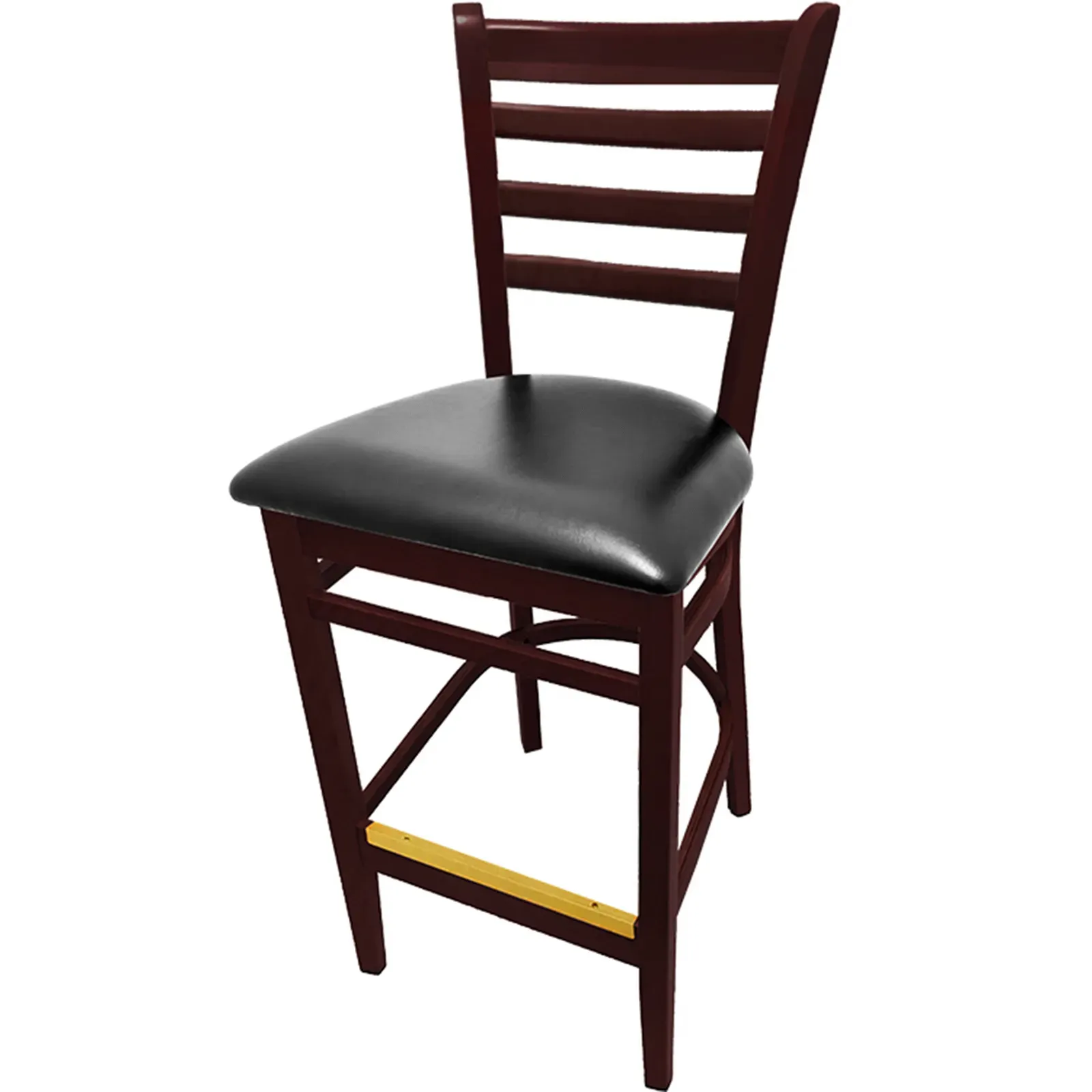 Enhance comfort, style, and atmosphere in your commercial restaurant with the Oak Street WB101MH-BLK Bar Stool. This solid wood barstool features a rich mahogany stain that adds a touch of elegance to any dining space. The black vinyl seat is not only visually appealing but also constructed with quality fabric-backed, commercial-grade vinyl for durability and easy maintenance. The frame is made of solid European beech, ensuring long-lasting strength and stability. With two leg supports and non-marring glides, this bar stool provides a secure and steady seating option for your customers. Although the seats ship unattached, simple seat attachment is required. Designed for indoor use only, this bar stool is perfect for restaurants, bars, and cafes. Stackable: No. Trust Oak Street to deliver exceptional quality and style to your establishment.