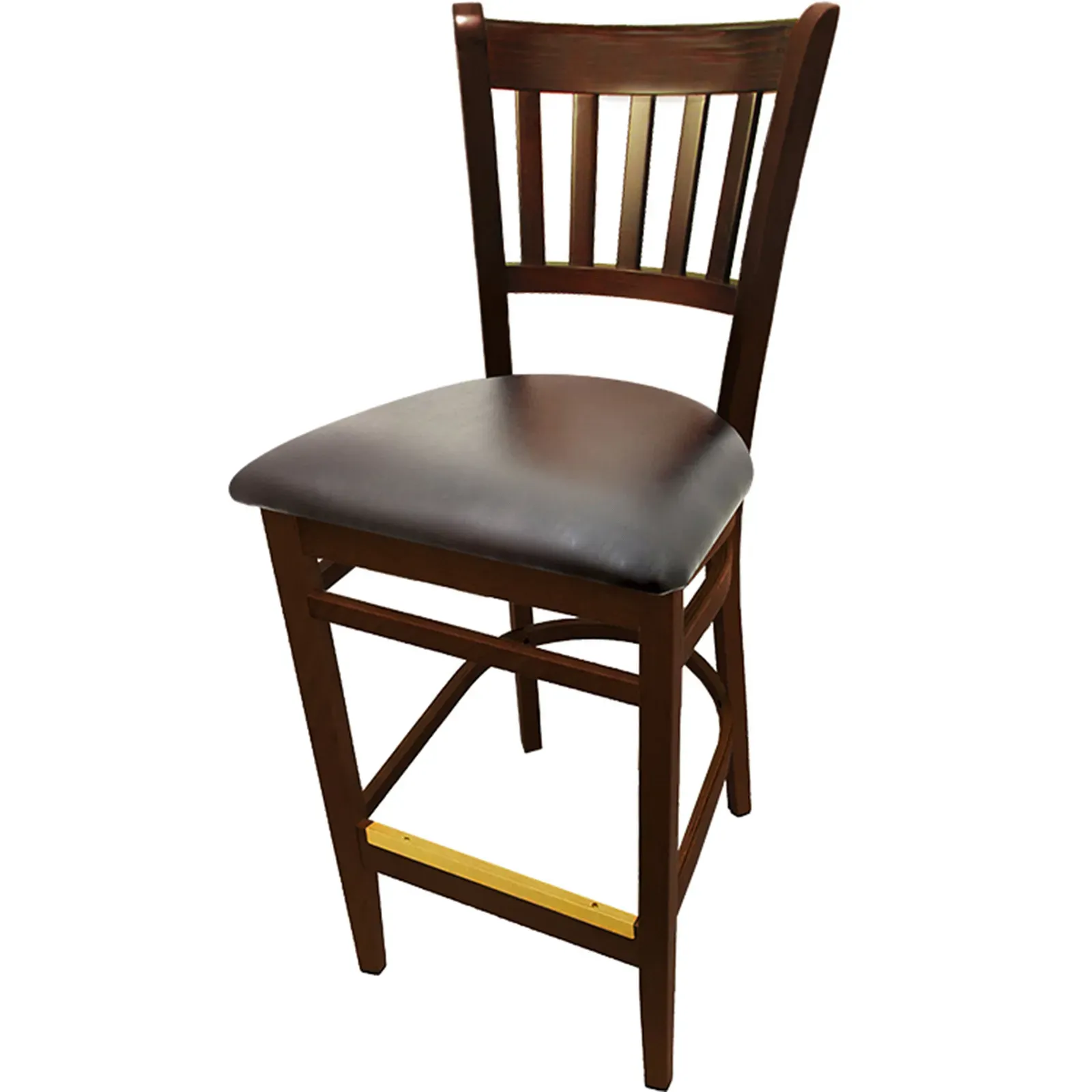 Deliver comfort and class to your restaurant decor with the Oak Street WB102WA-ESP Bar Stool. This indoor bar stool is designed to enhance the ambiance of any commercial restaurant setting. The frame is constructed of solid European beech, ensuring durability and longevity. The walnut stain adds a touch of elegance, while the espresso vinyl seat provides both comfort and easy maintenance. The seat is constructed with quality fabric-backed, commercial-grade vinyl, making it perfect for high-traffic areas. With two leg supports and non-marring glides, this bar stool offers stability and protection for your floors. Although the seats ship unattached, simple seat attachment is required. While not stackable, this bar stool is designed for indoor use only. Elevate your restaurant's atmosphere with the Oak Street WB102WA-ESP Bar Stool.