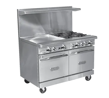 Optimize menu diversity with the Royal Range of California, RR-4RG12, Range, 36" Restaurant, Gas. This restaurant range is designed to meet the demands of a commercial kitchen, offering exceptional performance and durability. With four 30,000 BTU lift-off top burners and a 12" raised griddle with a 3/4" thick plate, this range provides versatile cooking options for any culinary creation. The manual controls allow for precise temperature adjustments, ensuring consistent results every time. The standard oven, equipped with a 12" x 12" cast iron grate, provides ample space for baking and roasting. Safety is a top priority with the safety valve, while the stainless steel front, sides, valve cover, kickplate, and 11" D high shelf add a touch of elegance to any kitchen. With a powerful 175,000 BTU output, CSA Flame and CSA Star certifications, and NSF approval, this range is a reliable and efficient choice for any commercial restaurant. Made in the USA, it guarantees authenticity and quality.
