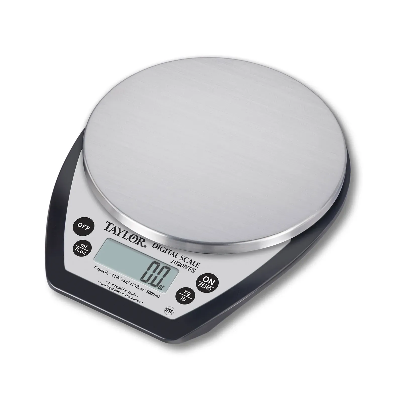 Introducing the Taylor Precision 1020NFS Digital Portion Control Scale, designed to optimize operations in commercial restaurants. With a capacity of 11lb x 0.1oz/5kg x 1g, this scale ensures precise measurements for portion control, recipe accuracy, and inventory management. The 0.6" LCD readout provides clear visibility, while the add and weigh feature allows for easy measurement of multiple ingredients in a single container. The round stainless steel platform on a black base not only adds a sleek touch to your kitchen but also ensures durability and easy cleaning. NSF certified, this scale meets the highest standards of food safety and sanitation. Powered by (2) AAA batteries (included), it is always ready for use. Trust Taylor Precision, a renowned vendor in the industry, to deliver a reliable and efficient digital scale that meets the demands of a busy commercial restaurant kitchen.