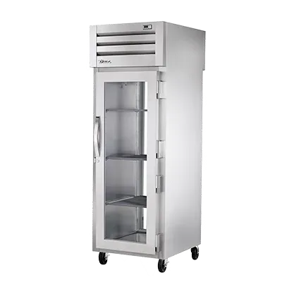 Maximize your food service potential with the True Manufacturing STG1RPT-1G-1G-HC Refrigerator, Pass-Thru. This top-of-the-line refrigerator is designed to meet the demands of a busy commercial restaurant. With its sleek stainless steel front and aluminum sides, it not only looks professional but is also built to last. The pass-thru design, featuring glass doors on both the front and rear with locks, allows for easy access and visibility of your stored items. The cam-lift hinges ensure smooth operation, while the digital temperature control ensures precise temperature management. Inside, you'll find an aluminum interior with three gray shelves, providing ample storage space. The LED interior lights illuminate the contents, making it easy to find what you need. With its ENERGY STAR certification and use of R290 Hydrocarbon refrigerant, this refrigerator is not only efficient but also environmentally friendly. Trust True Manufacturing to deliver a reliable and high-performing refrigerator for your commercial kitchen.