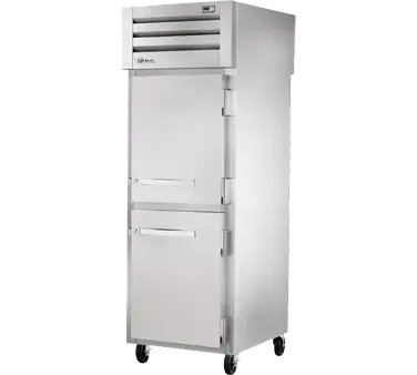 Serve with pride with the True Manufacturing STG1RPT-2HS-1S-HC Refrigerator, Pass-Thru. This top-of-the-line commercial refrigerator is designed to meet the demanding needs of any restaurant kitchen. With its sleek stainless steel front and aluminum sides, this refrigerator not only looks professional but is also built to last. The pass-thru design, featuring two stainless steel half doors in the front and one stainless steel door in the rear, allows for easy access and efficient workflow. The cam-lift hinges and digital temperature control ensure precise and reliable performance. Inside, you'll find three gray shelves and LED interior lights, providing ample storage space and excellent visibility. The 5" castors make it easy to move and clean around the unit. Plus, with its ENERGY STAR certification and use of R290 Hydrocarbon refrigerant, this refrigerator is not only environmentally friendly but also energy-efficient. Trust True Manufacturing to deliver the highest quality refrigeration solutions for your commercial restaurant needs.