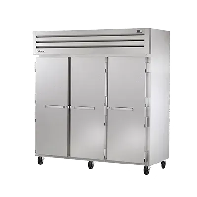 Equip your commercial kitchen with the True Manufacturing STR3R-3S Refrigerator, Reach-In. This top-of-the-line refrigerator is designed to meet the demands of a busy restaurant environment. With three stainless steel doors that come with locks and cam-lift hinges, you can ensure the safety and security of your ingredients. The digital temperature control allows you to easily adjust and monitor the temperature, ensuring that your food stays fresh and at the optimal temperature. The interior kits provide ample storage space and organization options for your ingredients. The LED lights not only illuminate the interior but also save energy. Made in the USA, this refrigerator is built to last and withstand the rigors of a commercial kitchen. With its stainless steel front, sides, and interior, it is not only durable but also easy to clean. The 5" castors make it easy to move and clean around the refrigerator. Invest in the True Manufacturing STR3R-3S Refrigerator, Reach-In, and experience the convenience and reliability it brings to your commercial kitchen.