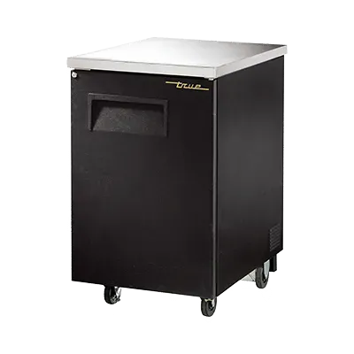 Introducing the True Manufacturing TBB-1-HC Back Bar Cabinet, Refrigerated - the perfect addition to drive restaurant profitability. Designed by True Manufacturing, a trusted name in the industry, this one-section back bar cooler is a must-have for any commercial restaurant. With a capacity to hold 30 six-packs or one half keg, it ensures you never run out of chilled beverages for your customers. The stainless steel countertop provides a sleek and durable surface, while the solid hinged door with lock keeps your stock secure. The LED interior lights illuminate the galvanized interior with a stainless steel floor, making it easy to find what you need. The black vinyl exterior adds a touch of sophistication to your establishment. This ENERGY STAR certified back bar cabinet is not only efficient but also environmentally friendly, thanks to the R290 Hydrocarbon refrigerant. With its reliable performance and made in the USA quality, the True Manufacturing TBB-1-HC is the ultimate choice for commercial restaurants looking to enhance their beverage service.