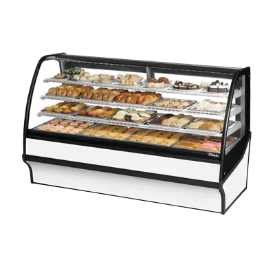 Achieve kitchen supremacy with the True Manufacturing TDM-DC-77-GE/GE-W-W Display Case. This non-refrigerated bakery display merchandiser is designed to elevate your restaurant's presentation and entice customers with its sleek and modern design. The curved glass front and glass sides provide a clear view of your delectable baked goods, while the two rear sliding glass doors make it easy to access and restock your products. With three tiered levels of adjustable white PVC coated wire shelves, you can showcase a variety of pastries, cakes, and breads. The LED interior lighting illuminates your treats, making them even more irresistible. Made in the USA, this display case features a white powder coated exterior with black trim, giving it a clean and professional look. Whether you're running a bakery, cafe, or restaurant, the True Manufacturing TDM-DC-77-GE/GE-W-W Display Case is the perfect addition to enhance your establishment's ambiance and boost sales.