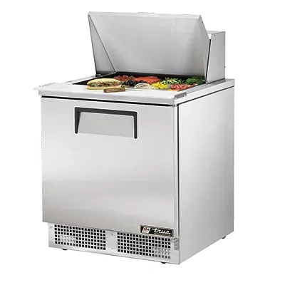 Deliver food perfection with the True Manufacturing TFP-32-12M Refrigerated Counter, Mega Top Sandwich / Salad Unit. This one-section, self-contained unit is designed to meet the demands of a busy commercial restaurant. With its 12 poly pans, you can easily store and organize your sandwich and salad ingredients. The stainless steel insulated cover ensures that your ingredients stay fresh and at the perfect temperature. The 8-inch thick cutting board provides a convenient workspace for preparing your dishes. The stainless steel front, top, and sides, along with the aluminum back, make this unit durable and easy to clean. The aluminum interior with a stainless steel floor is both hygienic and resistant to corrosion. With rear-mounted refrigeration and 2.5-inch castors, this unit is easy to move and position in your kitchen. Trust in the True Manufacturing TFP-32-12M to deliver the quality and reliability you need for your restaurant's food preparation.