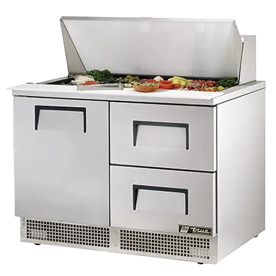 Equip your kitchen for success with the True Manufacturing TFP-48-18M-D-2 Refrigerated Counter, Mega Top Sandwich / Salad Unit. This two-section, self-contained unit is designed to meet the demands of a busy commercial restaurant. It features 18 poly pans, each with a 4-inch depth, perfect for storing and organizing your sandwich and salad ingredients. The stainless steel insulated cover ensures that your ingredients stay fresh and at the right temperature. The unit also comes with a durable 8-inch thick cutting board, providing a convenient workspace for food preparation. With its stainless steel front, top, and sides, as well as an aluminum back, this unit is built to withstand the rigors of a commercial kitchen. The two drawers and one door offer ample storage space, accommodating various pan sizes. The adjustable wire shelves allow for flexible storage options. The rear-mounted refrigeration system ensures efficient cooling, while the 2.5-inch castors make it easy to move the unit around. Trust True Manufacturing, a reputable brand known for its quality and reliability. Upgrade your kitchen with the True Manufacturing TFP-48-18M-D-2 Refrigerated Counter, Mega Top Sandwich / Salad Unit and experience enhanced efficiency and productivity.