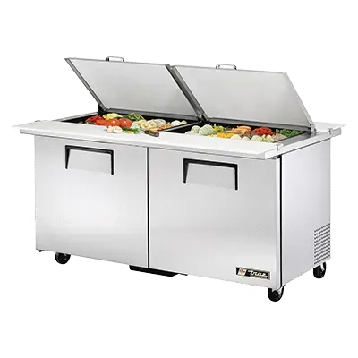 Equip your kitchen for success with the True Manufacturing TSSU-60-24M-B-DS-ST-HC Refrigerated Counter, Mega Top Sandwich/Salad Unit. This high-quality unit is designed to meet the demands of a busy commercial restaurant. With its dual side mega top, you can easily store and access all your sandwich and salad ingredients. The unit comes with 24 poly pans, each with a 4-inch depth, allowing you to organize your ingredients efficiently. The stainless steel insulated covers keep your ingredients fresh and protected. The cutting boards provide a convenient workspace for food preparation. Made in the USA, this unit features a stainless steel top, front, and sides, ensuring durability and easy cleaning. The aluminum back and interior with a stainless steel floor further enhance its longevity. The two full doors and four shelves offer ample storage space. Equipped with 5-inch castors, this unit is easy to move around your kitchen. The True Manufacturing TSSU-60-24M-B-DS-ST-HC is a reliable and efficient choice for any commercial restaurant.