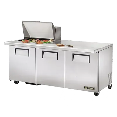 Upgrade your restaurant kitchen with the True Manufacturing TSSU-72-12M-B-HC Refrigerated Counter, Mega Top Sandwich/Salad Unit. This high-quality unit is designed to meet the demands of a busy commercial restaurant. With its stainless steel insulated cover and 8-7/8"D cutting board, it provides a convenient and hygienic workspace for preparing sandwiches and salads. The unit also features a spacious stainless steel top, front, and sides, ensuring durability and easy cleaning. The aluminum back and interior with a stainless steel floor further enhance its longevity. With three full doors and six shelves, you'll have ample storage space for your ingredients. The unit is equipped with 5" castors for easy mobility, allowing you to position it wherever it's most convenient. Additionally, the TSSU-72-12M-B-HC uses R290 Hydrocarbon refrigerant, making it energy-efficient and environmentally friendly. Trust True Manufacturing to deliver a reliable and efficient refrigerated counter that will elevate your restaurant's efficiency and productivity.
