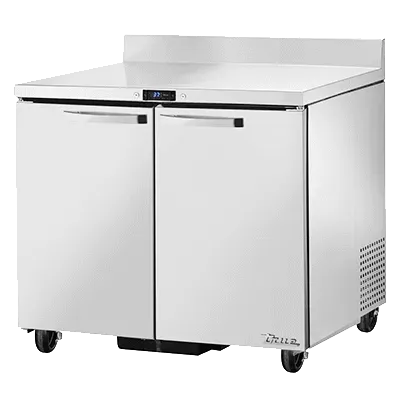 Kitchen innovation at its best, True Manufacturing presents the TWT-36-HC~SPEC3 Refrigerated Counter. This two-section work top refrigerator is a game-changer for commercial restaurants. With its SPEC Package 3, it offers a 16-gauge stainless steel top with a rear splash, ensuring durability and easy cleaning. The stainless steel front, sides, and back add a sleek and professional look to any kitchen. Inside, you'll find a stainless steel interior with four shelves, providing ample storage space for all your ingredients. The two heavy-duty stainless steel doors come with steel handles and a door lock for added security. The electronic temperature control with a digital display allows for precise temperature management, ensuring your food stays fresh. With 5" castors and rear mount, this refrigerator is easy to move and position. It runs on R290 Hydrocarbon refrigerant, making it energy-efficient and environmentally friendly. Trust True Manufacturing for top-quality refrigeration solutions that meet the demands of a busy commercial kitchen.