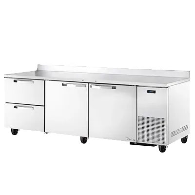 Culinary artistry redefined with True Manufacturing's TWT-93D-2-HC~SPEC3 Refrigerated Counter. This three-section work top refrigerator is designed to meet the demands of a busy commercial restaurant kitchen. The 16-gauge stainless steel top with a rear splash provides a durable and easy-to-clean surface for food preparation. The stainless steel front, sides, and back ensure long-lasting performance and a sleek appearance. With two heavy-duty stainless steel doors that come with locks, you can securely store your ingredients and supplies. The interior features stainless steel construction and four shelves, along with two drawers in each section, allowing for efficient organization and easy access to your items. The electronic temperature control with a digital display ensures precise temperature management, while the 5" castors make it easy to move the refrigerator for cleaning or rearranging. With its reliable performance, spacious storage capacity, and high-quality construction, the True Manufacturing TWT-93D-2-HC~SPEC3 is the perfect addition to any commercial restaurant kitchen.